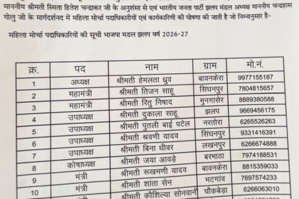 भारतीय जनता पार्टी महिला मोर्चा प्रदेश अध्यक्ष श्री मती विभा अवस्थी जी के निर्देशानुसार महासमुंद जिला अध्यक्ष श्री ऐत राम साहू जी के सहमति से …
