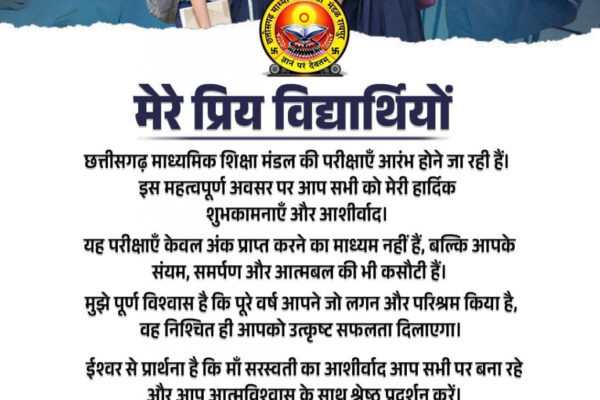 रायपुर: उपमुख्यमंत्री श्री विजय शर्मा ने छत्तीसगढ़ माध्यमिक शिक्षा मंडल की आगामी बोर्ड परीक्षाओं के पूर्व विद्यार्थियों को शुभकामनाएँ दी हैं। उन्होंने अपने एक्स अकाउंट …