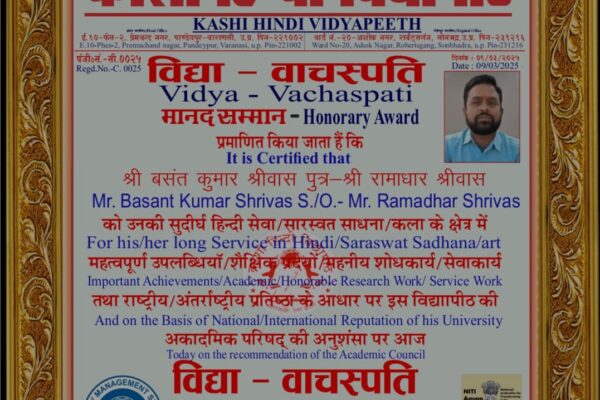 *साहित्यकार बसंत कुमार श्रीवास ‘वसंत’ विद्या वाचस्पति (मानद उपाधि डॉक्टरेट) से अलंकृत हुए* कांशी हिंदी विद्यापीठ वाराणसी ने हिंदी सेवा, शिक्षा, साहित्य, समाज सेवा को …