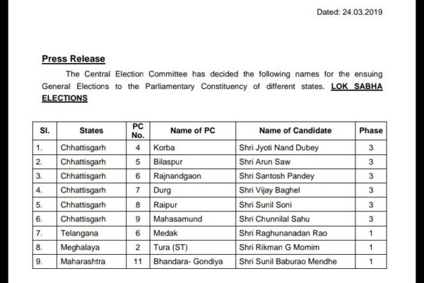 रायपुर। काफी जदोजहद के बाद आखिरकार बीजेपी ने लोकसभा उम्मीदवारों की सूची जारी कर दी हैं। 6 लोगों का नाम जारी किया है। जिसमें रायपुर …