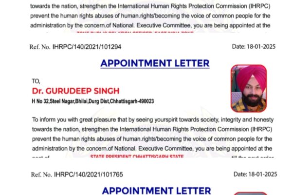 *अंतर्राष्ट्रीय मानवाधिकार संरक्षण आयोग* के राष्ट्रीय अध्यक्ष श्री *डॉ मोहम्मद मुजाहिद* जी के आदेशानुसार छत्तीसगढ़ प्रदेश टीम के सदस्यों के कार्य को देखते हुए पदोन्नति …