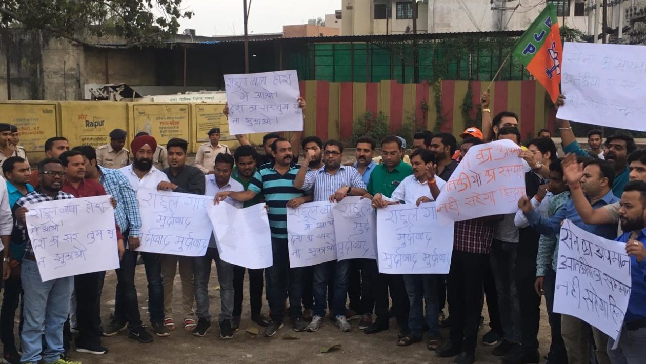 रायपुर। कांग्रेस अध्यक्ष राहुल गांधी द्वारा दुनिया के मोस्ट वांटेंड मसूद अजहर के लिए सम्मानजनक शब्द “जी” कहकर संबोधित किए जाने से देश के प्रत्येक राष्ट्रभक्त की भावना आहत हुई है। कांग्रेस अध्यक्ष राहुल गांधी के दुर्दांत आतंकवादी के प्रति ऐसे सम्मानजनक शब्दों के प्रयोग से आक्रोशित भारतीय जनता युवा मोर्चा के कार्यकर्ताओं ने मंगलवार को राजधानी रायपुर के बुढ़ा तालाब स्थित धरना स्थल में राहुल गांधी का पुतला जलाकर उग्र प्रदर्शन किया। गौरतलब है कि 11 मार्च को कांग्रेस के बूथ कार्यकर्ता सम्मेलन में राहुल गांधी ने आतंकवादी के लिए सम्मानजनक शब्द का प्रयोग किया था। भाजयुमो कार्यकर्ताओं का कहना है कि चुनावी रंग में रंग चुकी कांग्रेस और उनके अध्यक्ष सोची समझी रणनीति के तहत ऐसा कर रहे हैं। भाजयुमो ने इसे विशेष वर्ग के मतो को साधने की घिनौनी साजिश बताया है।