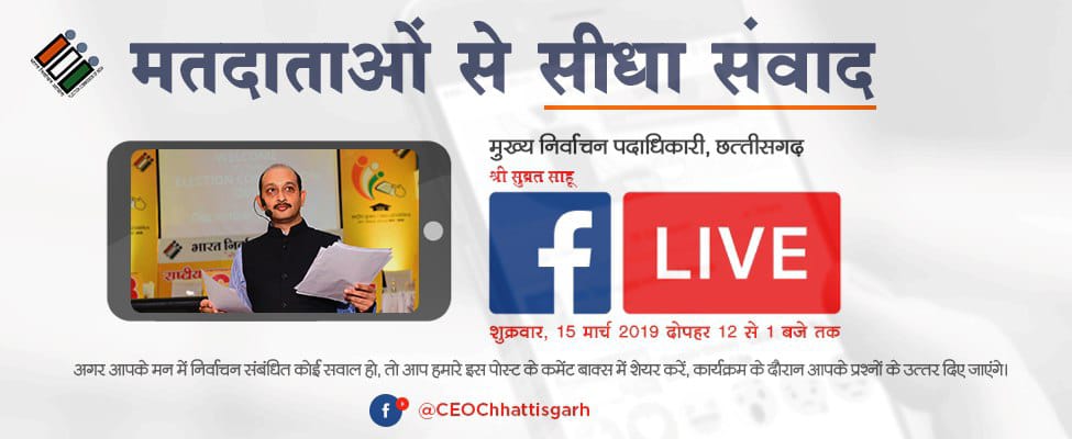वे शुक्रवार 15 मार्च को दोपहर 12 बजे से एक बजे तक सीईओ कार्यालय के फेसबुक पेज पर लाइव मौजूद रहेंगे। प्रदेश के नागरिक उक्त अवधि के पूर्व भी अपनी जिज्ञासा और सवाल फेसबुक पेज @ceochhattisgarh पर दर्ज कर सकते हैं।