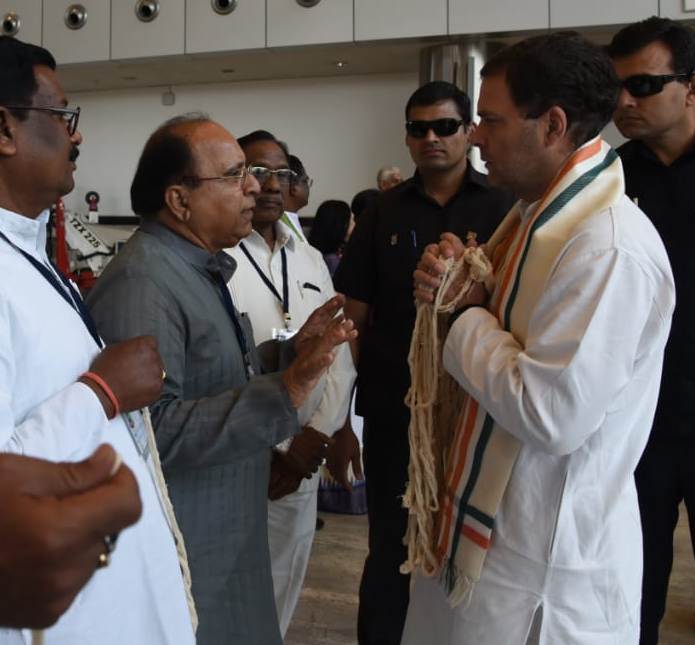 रायपुर, यूनिवर्सल हेल्थ स्कीम के लिए आयोजित चिकित्सकों व विशेषज्ञों की बैठक में शामिल होने आज सुबह 11 बजे कांग्रेस के राष्ट्रीय अध्यक्ष राहुल गांधी विषेश विमान से रायपुर पहुचे। रायपुर विमान तल पर उनके स्वागत के लिए कांग्रेस के प्रभारी महासचिव पी.एल. पुनिया, मुख्यमंत्री भूपेश बघेल, स्वास्थ्य मंत्री टी.एस. सिंहदेव, गृहमंत्री ताम्रध्वज साहू सहित कई नेताओं ने उनका स्वागत किया।