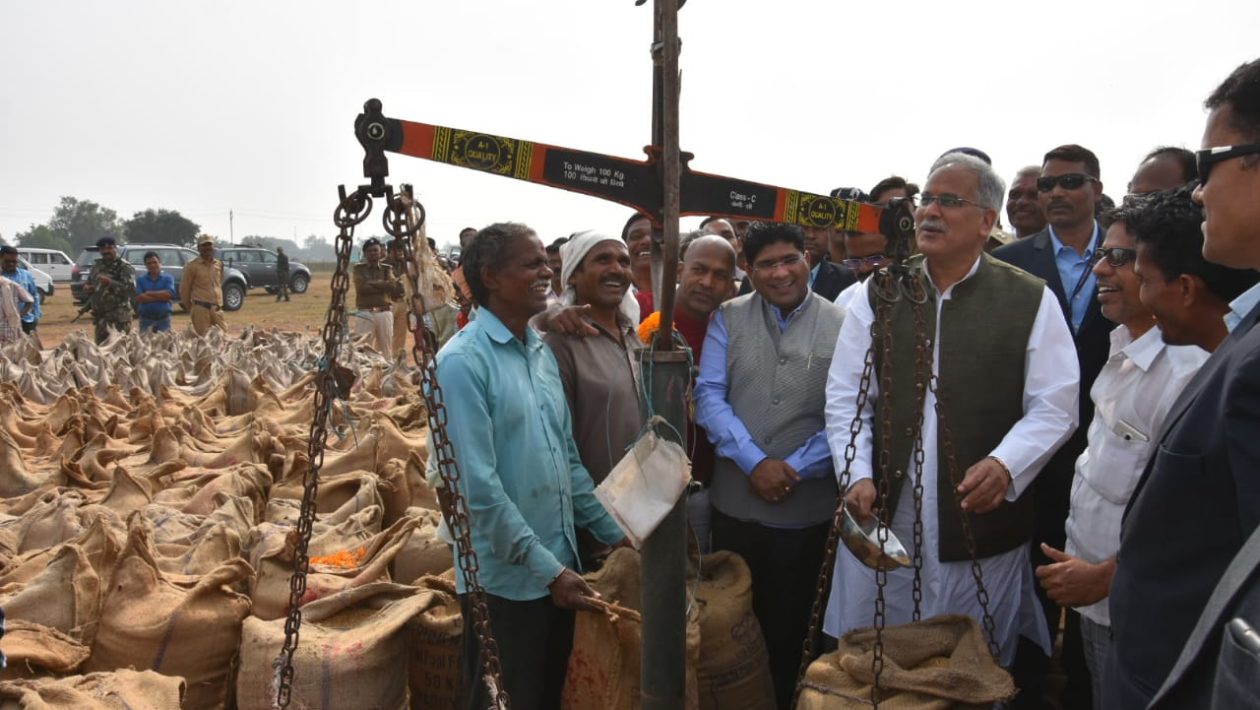 जामगांव एम में किसान श्री तोखनलाल वर्मा का धान खुद मुख्यमंत्री ने तौला।