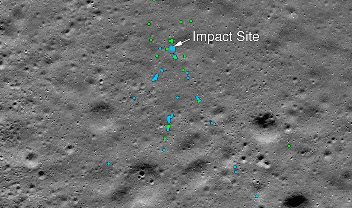 शानमुगा ने मुख्य क्रैश साइट के उत्तर-पश्चिम में लगभग 750 मीटर की दूरी पर स्थित मलबे की पहचान की थी। यह पहले मोजेक (1.3 मीटर पिक्सल, 84 डिग्री घटना कोण) में एक एकल उज्ज्वल पिक्सल पहचान थी। नवंबर मोजेक इंपैक्ट क्रिएटर, रे और व्यापक मलबा क्षेत्र को सबसे अच्छा दिखाता है। मलबे के तीन सबसे बड़े टुकड़े 2×2 पिक्सल के हैं।