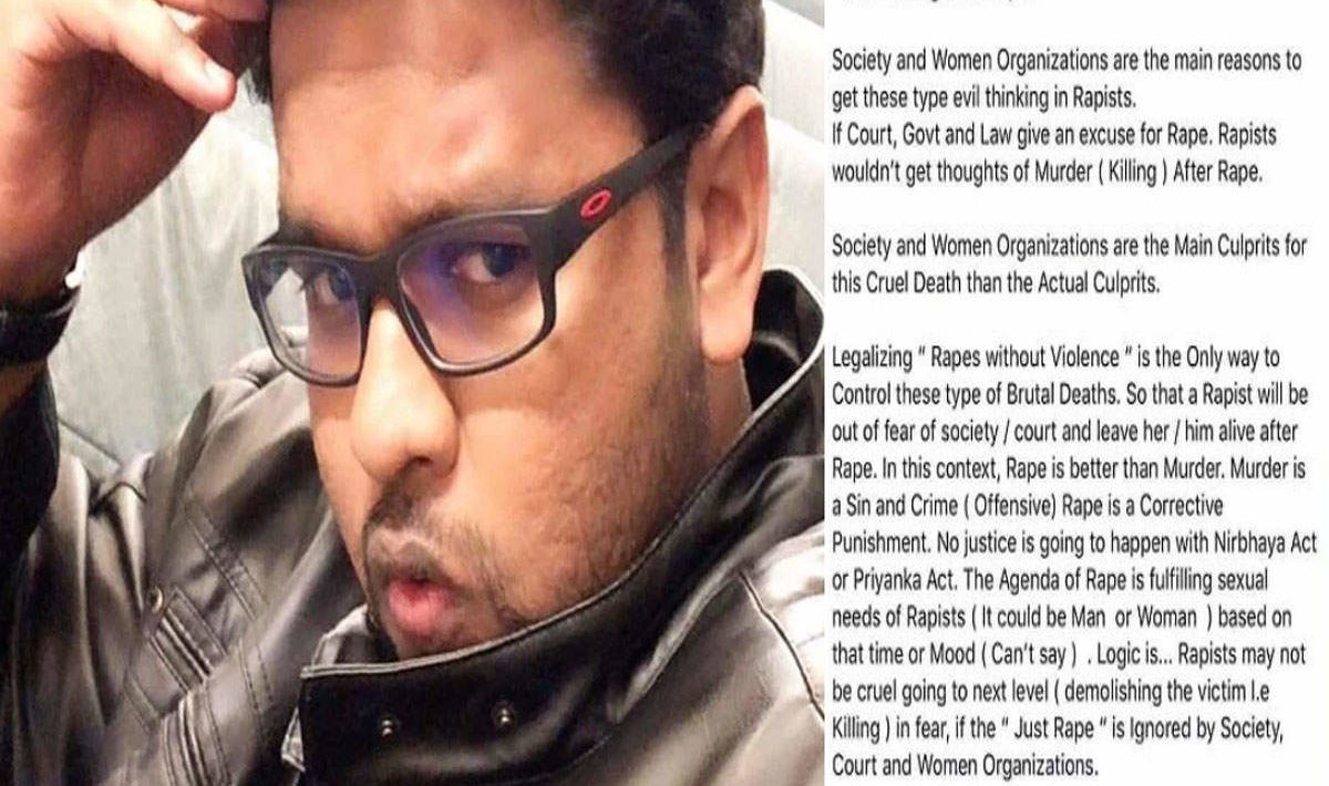 स्मॉल टाइम फिल्ममेकर बताए जाने वाले डेनियल श्रवण ने अपने फेसबुक वॉल पर हैदराबाद रेपकांड को लेकर विचार व्यक्त किए। इसमें उन्होंने सलाह दी कि अगर रेप के बाद महिला को अपनी जान बचानी है तो बेहतर है कि वह रेपिस्ट को संतुष्ट करे और उन्हें कॉन्डम दे। इतना ही नहीं डेनियल ने रेप के बाद हत्या किए जाने के पीछे समाज और महिला संस्थानों को जिम्मेदार ठहराया और हिंसा के बिना किए गए रेप को कानूनी मंजूरी देने की भी सलाह दे डाली।