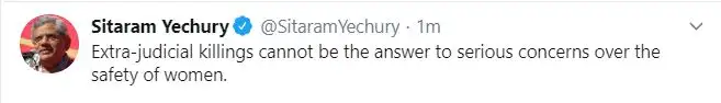 गैर-न्यायिक हत्याएं महिलाओं के प्रति हमारी चिंता का जवाब नहीं हो सकतीं। उन्होंने कहा कि बदला कभी न्याय नहीं हो सकता। इसके साथ ही उन्होंने सवाल उठाया कि आखिर 2012 में दिल्ली में हुए निर्भया गैंगरेप कांड के बाद लागू हुए कड़े कानून को हम सही से लागू क्यों नहीं कर पा रहे है।