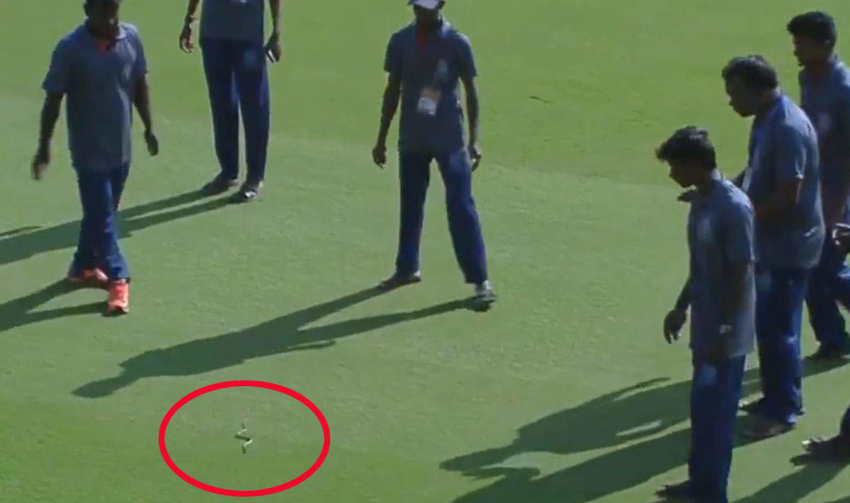 बीसीसीआई डमेस्टिक के आधिकारिक ट्विटर हैंडल से एक विडियो क्लिप पोस्ट की गई है जिसमें मैदान पर एक सांप रेंगता दिख रहा है। विडियो में नजर आ रहा है कि मैदान से उसे बाहर निकालने की कोशिश की जा रही है।