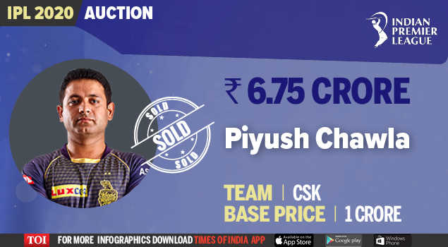 नीलामी में भारतीय खिलाड़ियों में सबसे ऊंची बोली पाने वाले लेग स्पिनर पीयूष चावला को चेन्नै सुपर किंग्स ने खरीदा। पूर्व भारतीय कप्तान एमएस धोनी इस टीम के कप्तान हैं और पीयूष का उनसे बेहतर संबंध माना जाता है। सीएसके ने चावला के लिए 6.75 करोड़ रुपये की बोली लगाई। चावला लंबे समय के कोलकाता नाइट राइडर्स की टीम में थे, लेकिन पिछले महीने फ्रैंचाइजी ने उन्हें रिलीज कर दिया था। चावला 2007 में टी20 विश्व कप और 2011 में एकदिवसीय विश्व कप जीतने वाली भारतीय टीम के सदस्य थे। चेन्नै की टीम में हरभजन सिंह, इमरान ताहिर और रविंद्र जडेजा जैसे स्पिनरों की मौजूदगी में चावला को अंतिम 11 में जगह बनाने के लिए संघर्ष करना होगा।