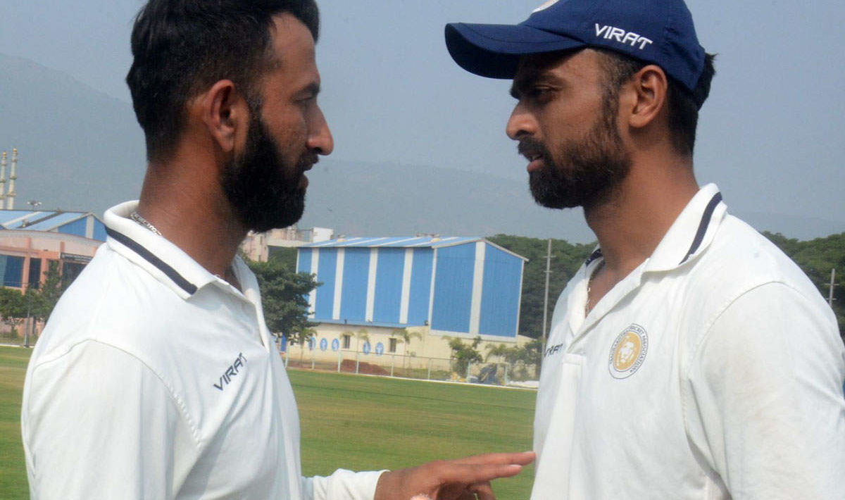जीशान अंसारी (42 रन देकर 3 विकेट) ने पटेल को आउट किया। पुजारा कई मौकों पर टीम को मुश्किल से निकालते रहे हैं, उनसे ऐसा ही करने की उम्मीद थी लेकिन वह सिर्फ 10 गेंद ही खेल सके और सौरभ की गेंद पर आउट हुए। उन्होंने केवल 3 रन का योगदान दिया।