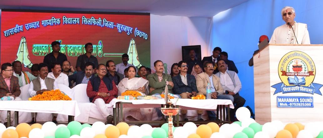 सूरजपुर ,छ0ग0 शासन पंचायत एवं ग्रामीण विकास, लोक स्वास्थ्य एवं परिवार कल्याण, चिकित्सा शिक्षा योजना आर्थिक एवं सांख्यिकी व 20 सूत्रीय कार्यक्रम वाणिज्यिक कर (जी0एस0टी0) मंत्री टी0एस0 सिंहदेव के मुख्य अतिथि में एवं स्कूल शिक्षा, अनुसूचित जाति/जनजाति/अन्य पिछड़ा वर्ग व अल्पसंख्यक कल्याण व सहकारिता विभाग के मंत्री डॉ0 प्रेमसाय सिंह टेकाम की उपस्थिति में आज सूरजपुर जिले के ग्राम पंचायत सिलफिली के हायर सेकेण्डरी स्कूल के वार्षिकोत्सव एवं अभिभावक तथा पुरस्कार वितरण कार्यक्रम संपन्न हुआ। इस अवसर पर विभिन्न सांस्कृतिक तथा बौधिक गतिविधियो विजेताओं, राज्य स्तरीय अन्तर विद्यालय, राष्ट्रीय स्तर के खिलाडि़यो, विगत वर्ष में अपने कक्षाओं में प्रथम स्थान प्राप्त करने वाले छात्र-छात्राओं तथा विभिन्न श्रेणियों कि अन्तर्गत सर्वश्रेष्ठ छात्र-छात्राओं को प्रमाण-पत्र एवं ट्राफी प्रदान कर सम्मानित किया गया। कार्यक्रम का शुभांरभ मुख्य अतिथि सहित सभी अतिथियों ने मॉं सरस्वती के चित्र पर माल्यापर्ण कर दीप प्रज्वलित किया।