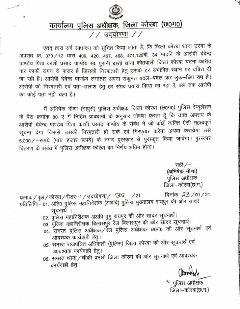 एक करोड़ रूपये धान खरीदी की गड़बड़ी मामले के मुख्य आरोपी देवेंद्र पांडेय के खिलाफ एसपी ने किया इनाम की घोषणा.