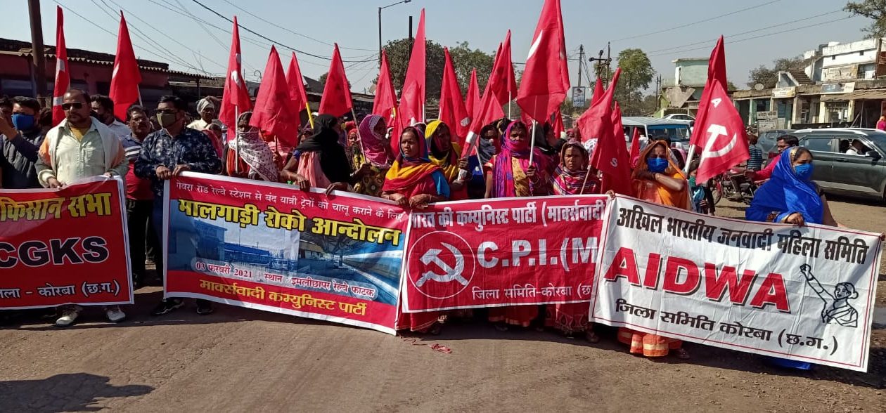 कोरबा। लॉक डाउन के बाद से कुसमुंडा के गेवरा रोड स्टेशन से बंद पड़ी सभी ट्रेनों को चालू करने की मांग पर आज माकपा द्वारा आहूत रेल चक्का जाम आंदोलन को आम जनता का अभूतपूर्व समर्थन मिला। सीटू, छत्तीसगढ़ किसान सभा, जनवादी महिला समिति और रेल संघर्ष समिति के साथ ही व्यापारियों और ऑटो चालकों के संगठनों द्वारा इस आंदोलन में भाग लेने के कारण एक ओर सैकड़ों नागरिक सड़कों पर दिखे, तो दूसरी ओर जिला प्रशासन, रेल प्रशासन और एसईसीएल प्रबंधन भी भारी दबाव में दिखे। रेल प्रशासन ने इस मांग पर सकारात्मक कार्यवाही करने के लिए 15 दिनों की लिखित मोहलत मांगी है।