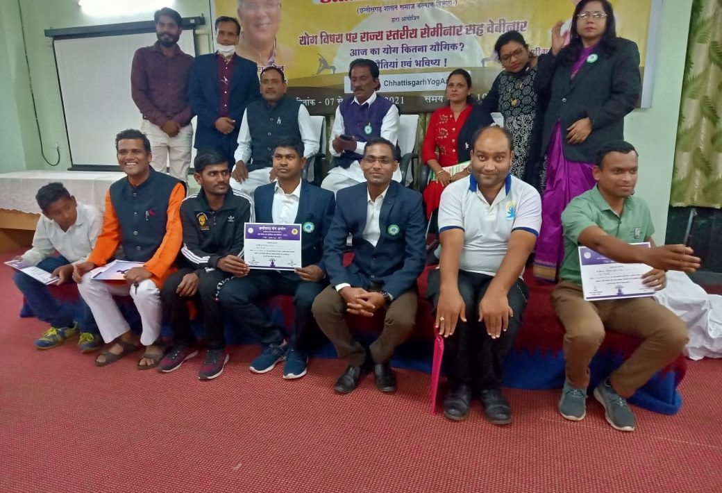 योग आयोग द्वारा राजधानी रायपुर के माना कैम्प में समाज कल्याण विभाग के सभागार में तीन दिवसीय योग दिवस का सेमिनार आयोजित हुआ सेमिनार के समापन के अवसर पर दिल्ली से नैनो के राष्ट्रीय अध्यक्ष आंनद बिरादर ने वर्चुअल के माध्यम से सेमिनार को सम्बोधित किया राषटीय अध्यक्ष ने सेमिनार के सफल आयोजन के लिए सभी को बधाई दिया आयोजन में उपस्थित सभी लोगो को स्टीकर योगा का सम्मानित पत्र देकर सभी को सम्मानित किया गया, आयोजन में अखिलेश तिवारी योग आयोग के आयोजन के संयोजक एवं छबि लाल साहू पतंजलि राज्य सहायक समन्वयक सीएल सोनवानी आई एनवॊ के प्रदेश सचिव व छत्तीसगढ़ प्रांत के संयोजक डॉ मनोज ठाकरे आईएनवॊ के साथ-साथ छबि लाल साहू पतंजलि से डॉक्टर दिनेश नागपुरी डॉ चित्रा लेखक धमतरी रावतपुरा सरकार के छात्र गण मैट्स यूनिवर्सिटी के डेलिगेट्स छात्र रविशंकर विश्वविद्यालय के छात्र योग शिक्षक के साथ-साथ अनेक संस्थाओं से जो योग क्षेत्र में कार्य कर रहे हैं वह फिजिकली रूप से सभागार में उपस्थित थे सोशल डिस्टेंस का पालन करते हुए इस आयोजन में शामिल हुए