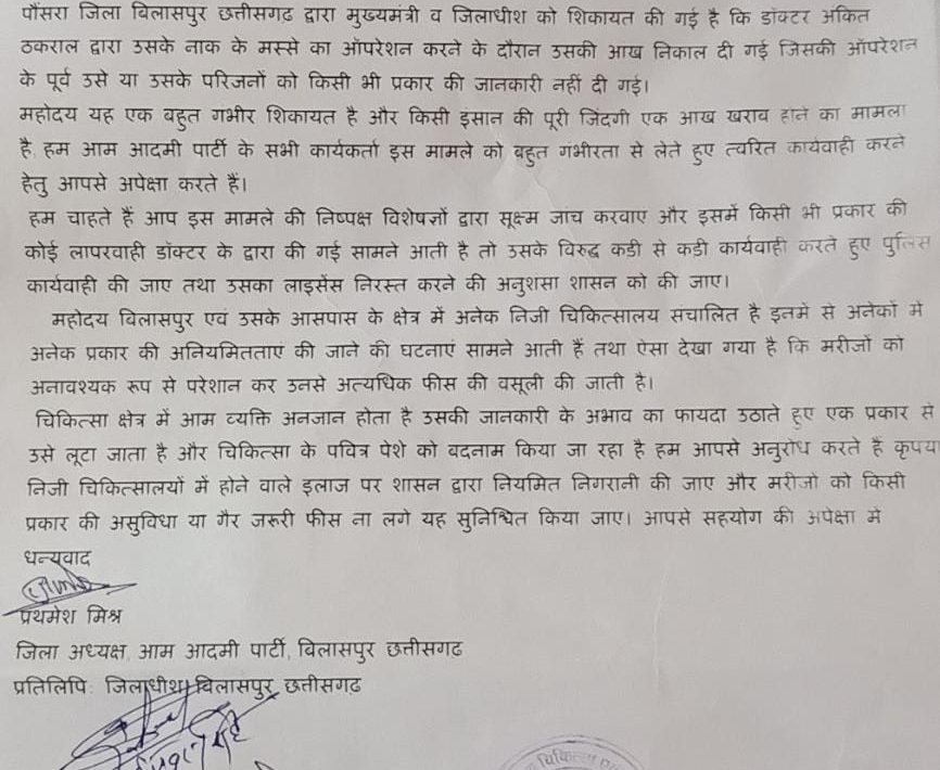 आम आदमी पार्टी द्वारा भी मुख्य चिकित्सा अधिकारी को ज्ञापन सौंपकर उपरोक्त घटना में तुरंत संज्ञान लेते हुए डॉक्टर के विरुद्ध कार्यवाही करने की अपील की गई है । आम आदमी पार्टी द्वारा मुख्य चिकित्सा अधिकारी तथा प्रदेश के मुखिया भूपेश बघेल जी से अनुरोध है कि उपरोक्त संबंध में संज्ञान लेते हुए तुरंत डॉक्टर के विरुद्ध कार्रवाई कराई जाए और पीड़ित परिवार को न्याय दिलाया जाए