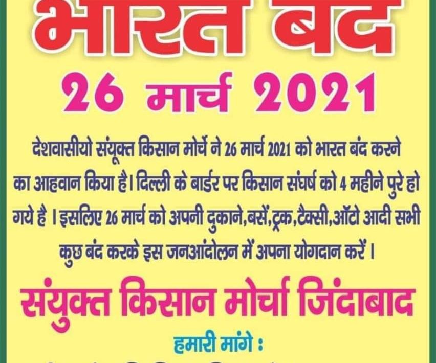 अखिल भारतीय किसान संघर्ष समन्वय समिति और संयुक्त किसान मोर्चा सहित सैकड़ों किसान संगठनों के देशव्यापी आह्वान पर किसान विरोधी तीनों कानूनों और बिजली संशोधन कानून को वापस लेने, सी-2 लागत आधारित न्यूनतम समर्थन मूल्य को कानूनी दर्जा देने, पेट्रोल-डीजल-गैस की कीमतों को आधा करने और श्रम कानूनों को बहाल करने की मांग को लेकर कल 26 मार्च को आहूत भारत बंद को छत्तीसगढ़ में सफल करने के लिए छत्तीसगढ़ किसान आंदोलन से जुड़े घटक संगठन पूरी ताकत से मैदान में उतरेंगे। इन संगठनों में छत्तीसगढ़ किसान सभा, आदिवासी एकता महासभा, राजनांदगांव जिला किसान संघ, हसदेव अरण्य बचाओ संघर्ष समिति (कोरबा, सरगुजा), किसान संघर्ष समिति (कुरूद), आदिवासी महासभा (बस्तर), दलित-आदिवासी मजदूर संगठन (रायगढ़), दलित-आदिवासी मंच (सोनाखान), भारत जन आन्दोलन, गाँव गणराज्य अभियान (सरगुजा), आदिवासी जन वन अधिकार मंच (कांकेर), पेंड्रावन जलाशय बचाओ किसान संघर्ष समिति (बंगोली, रायपुर), उद्योग प्रभावित किसान संघ (बलौदाबाजार), रिछारिया केम्पेन, छत्तीसगढ़ प्रदेश किसान सभा, छत्तीसगढ़ किसान महासभा, परलकोट किसान कल्याण संघ, वनाधिकार संघर्ष समिति (धमतरी), आंचलिक किसान संघ (सरिया) आदि संगठन शामिल हैं।