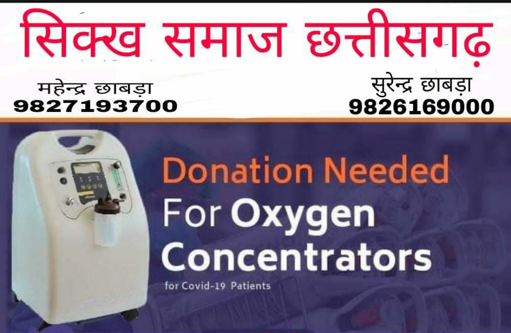 रायपुर/वैश्विक महामारी कोरोना से हो रही मौतों से जहां एक ओर श्मशान घाट पटे पड़े हैं वहीं दूसरी ओर अस्पतालों में जगह नही मिलने के कारण बिना ऑक्सीजन के संक्रमितों की सांसें उखड़ रही है ऐसी भयावह स्थिति में सिक्ख समाज छत्तीसगढ़ ने एक ऐसी अनुकरणीय पहल की है कि जिन कोरोना संक्रमित मरीज़ों को हॉस्पिटल में जगह नही मिल रही है उन्हें उनके घरों में जीवन रक्षक आक्सीजन कॉन्संट्रेटर मशीन छत्तीसगढ़ के दूरदराज छोटे इलाकों में जहां मरीज शहर के हॉस्पिटल में पहुंचने से पहले ही दम तोड़ रहे है उपलब्ध कराएगा