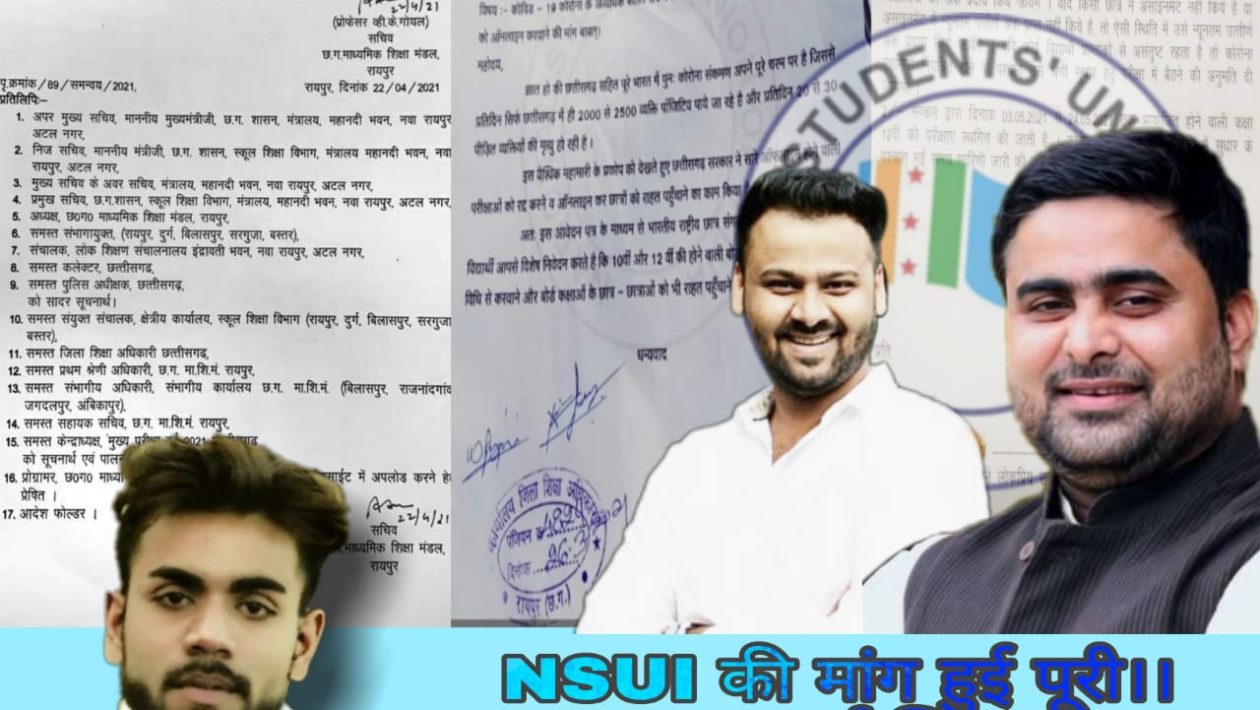 जिला संयोजक सुर्यप्रताप बंजारे ने NSUI के बैनर तले व अपने उच्च पदाधिकारियों के आदेश से छात्रों के बीच जाकर उनकी समस्याएं सुनकर जिला शिक्षा अधिकारी से मुलाकात कर इस वैश्विक बीमारी को देखते हुवे परीक्षा को रद्द या ऑनलाइन मोड़ पर लेने की अपील किया था जो कि आज पूरा हो गया हैं ।