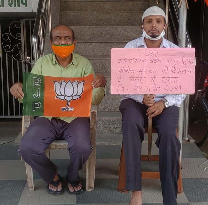 करोना संक्रमण के बचाव पर छत्तीसगढ़ कांग्रेस सरकार विफल युनूस कुरैशी प्रदेश उपाध्यक्षभारतीय जनता पार्टी अल्पसंख्यक मोर्चा युनूस कुरैशी ने कहा करोना संक्रमण के बचाव पर छत्तीसगढ़ कांग्रेस सरकार की विफल कऔर इसी विरोध में आज अपने निवास स्थान के बाहर धरना दिया, जहाँ युनूस कुरैशी के साथ भाजपा नेता श्री मिर्जा मकबूल बेग भी धरना में उपस्थित रहे