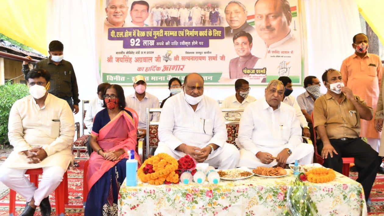 रायपुर। माना स्थित वार्ड नंबर 12 के पीएल होम के 12 बैरकों का काम विगत चार वर्षों से अधूरा था। रायपुर ग्रामीण विधायक सत्यनारायण शर्मा की मांग पर प्रदेश सरकार ने कार्य पूरा करने 92 लाख रुपए की स्वीकृति प्रदान की है। जिस पर स्थानीय जनप्रतिनिधियों व नागरिकों ने आभार व्यक्त कर एक कार्यक्रम आयोजित किया। कार्यक्रम में मंत्री जयसिंह अग्रवाल व विधायक सत्यनारायण शर्मा का सम्मान किया गया।