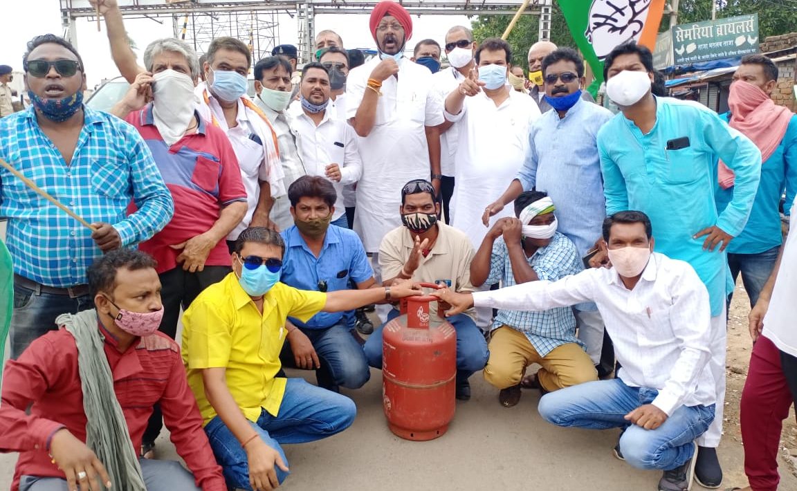 गैस पेट्रोल डीजल की बढ़ती महंगाई को लेकर विधायक जुनेजा के नेतृत्व में कार्यकर्ताओं ने फाफाडीह नाका पर किया चक्का जाम