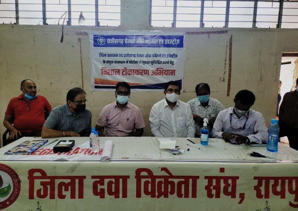 रायपुर,23 जून 2021। छत्तीसगढ़ चेम्बर ऑफ कॉमर्स एंड इंडस्ट्रीज एवं कॉन्फेडरेशन ऑफ आल इंडिया ट्रेडर्स (छ.ग.चेप्टर) के बैनर तले आज मंगलवार को मेडिकल कांपलेक्स सहित डूमरतराई थोक बाजार में टीकाकरण अभियान की शुरूआत की गई।