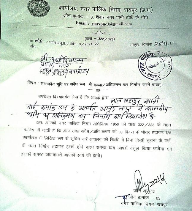 शासकीय भूमि पर अवैद्य कब्जा कर अतिक्रमण करने संबंधित सूचना जारी किया जाना यह रायपुर नगर निगम पर सावालिया निशान खड़ा करता है उक्त पूरा मामला लाल बहादुर शास्त्री वार्ड क्रमांक 34 आनंद नगर का है नगर पालिका निगम द्वारा खुर्शीद आलम के नाम पर नोटिस भेजा गया है जब की वर्तमान में खुर्शीद आलम के नाम पर कोई संपत्ति व कब्जा धारी भूमि नही है बिना जाँच नगर निगम द्वारा फर्जी नोटिस जारी किया गया है जिससे आवेदक खुर्शीद आलम वर्तमान में न्यूज़ नॉक इंडिया न्यूज़ चैनल के प्रधान संपादक है इससे उनकी छवि काफी धूमिल हुई है अगर जल्द ही नगर पालिका निगम के अधिकारी द्वारा किये गए फर्जी सूचना पत्र पर कार्यवाही नही करते है तो उसकी पूरी जवाबदारी नगर पालिका प्रशासन की मानी जायेगी साथ ही नगर निगम द्वारा अधिनियम 1956 की धारा 322 /323 के तहत नोटिस भेजी गई है जल्द ही इस पर नगर पालिका प्रशासन को संज्ञान लेना चाहिए व संबंधित उक्त कर्मचारी पर तत्काल कार्यवाही की जाए तथा पार्षद कामरान अन्सारी को स्थिति कि कोइ जानकारी नही थी लिखित मे कार्यवाही के लिये पार्सद कामरान अन्सारी को भी उचित कार्यवाही बाबत आवेदन दिया गया है तथा उक्त सम्बन्ध मे वकिल के माध्यम लिगल कार्यवाही कि तैयारी कि जा रही हैं