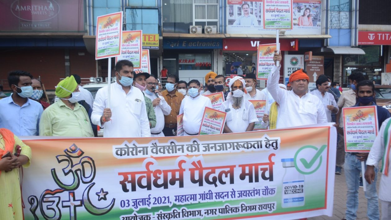 आज संध्या महापौर एजाज ढेबर की सकारात्मक पहल पर नगर पालिक निगम रायपुर के संस्कृति विभाग के तत्वावधान में सर्व समाज प्रमुखों की सहमति पर पूर्व निर्धारित कार्यक्रम के अनुसार नगर निगम रायपुर के मुख्यालय भवन महात्मा गॉधी सदन से सिटी कोतवाली चौक एवं मालवीय रोड होते हुए जयस्तंभ चौक तक सर्व समाजों के गणमान्य प्रतिनिधियों ने महापौर एजाज ढेबर, सभापति प्रमोद दुबे, उपनेता प्रतिपक्ष मनोज वर्मा, संस्कृति विभाग अध्यक्ष आकाश तिवारी, अनुसूचित जाति एवं अनुसूचित जनजाति विभाग अध्यक्ष सुन्दर जोगी, खेलकूद एवं युवा कल्याण विभाग अध्यक्ष जितेन्द्र अग्रवाल की उपस्थिति में हाथों में कोरोना टीकाकरण अभियान के प्रति जन-जन में जागृति लाने लोक स्वास्थ्य हित की दृष्टि से तख्तीयां लेकर सर्वधर्म पैदल मार्च निकाला एवं राजधानीवासियों से अपने -अपने परिवारजनों के स्वास्थ्य की सुरक्षा हेतु शीघ्र कोरोना टीकाकरण केन्द्रों में जाकर सपरिवार पात्रता अनुसार कोरोना टीका लगवाकर शासन के लोक स्वास्थ्य सुरक्षा अभियान में सहभागी बनकर अपना नागरिक कर्तव्य निभाने आगे आने का आव्हान किया।