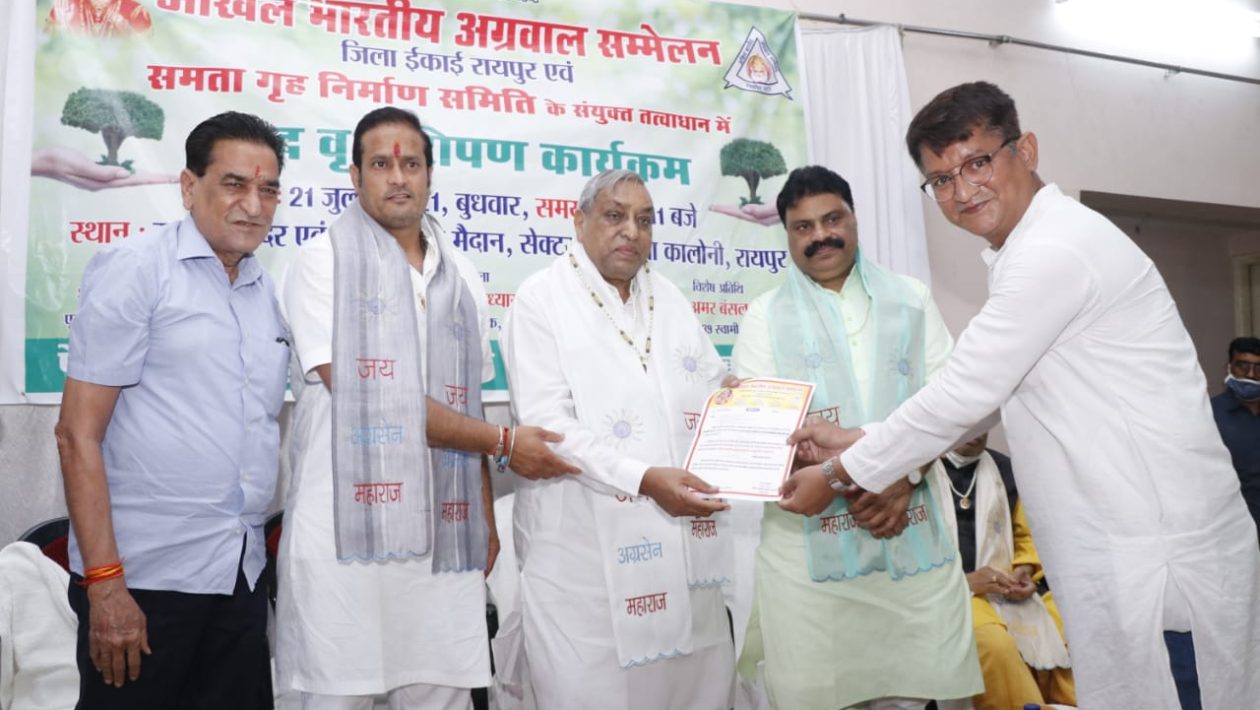 अग्रवाल समाज के द्वारा श्री विकास उपाध्याय जी विधायक एव संसदीय सचिव जी की अध्यक्षता एव श्री बाबु जी सत्यनारायण शर्मा पूर्व मंत्री विधायक जी एव अखिल भारतीय अग्रवाल सम्मेलन के राष्ट्रीय वरिष्ठ उपाध्यक्ष श्री ईश्वर प्रसाद अग्रवाल जी एव श्री अमर बंसल जी पार्षद के उपस्थीति में दशहरा मैदान चौबे कॉलोनी रायपुर में वृक्षारोपण किया गया और साथ ही रायपुर पश्चिम विधानसभा के विधायक प्रतिनिधि श्री विकास अग्रवाल जी को अखिल भारतीय अग्रवाल सम्मेलन जिला इकाई के रायपुर जिला महामंत्री पद पर नियुक्ति किया गया