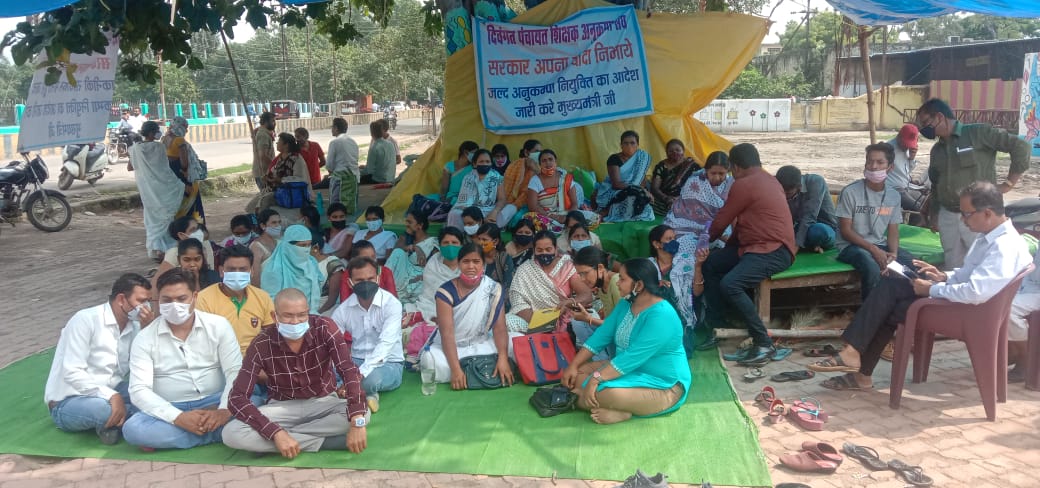दिवंगत पंचायत शिक्षक के 935 आश्रित परिवार को विगत 16 सालों से अनुकंपा नियुक्ति नहीं दी गई अनेकों बार नियुक्ति के लिए उन्होंने मांग किया समय-समय पर सत्ता पर बैठी पार्टियों को लगातार संपर्क करते रहे उनसे अपने अधिकार की बात करते रहे लेकिन किसी ने इस पर संज्ञान नहीं लिया स्थिति ऐसी हो गई है कि यह आश्रित परिवार निराश्रित हो चुका है इनके आगे पीछे कोई नहीं है इनका घर परिवार चलाना मुश्किल हो रहा है इनके घर में दाने दाने के लाले पड़ गए हैं बच्चों की शिक्षा नहीं हो पा रही है आप इस समस्या से यह महिलाएं इतनी परेशान है कि आज महिलाएं सड़क पर उतर गई हैं और आज तेरा 14 दिन हो चुके हैं अभी तक सरकार का कोई भी जवाबदार व्यक्ति आ करके महिलाओं की समस्या को सुनने के लिए तैयार नहीं है यह महिलाएं 24 घंटे उसी पेड़ के नीचे बैठी रहती है इतनी बरसात में उनके आंदोलन को चलने के लिए बार-बार ऐसे रणनीतियां बनाई जाती है सरकार के द्वारा जिससे वह निराश हो जाए लेकिन नारी शक्ति जिंदाबाद थी है और रहेगी यह शक्तियां पीछे हटने वालों में से नहीं है अपने अधिकार की लड़ाई लड़ रही है और इस पर इनको जीत मिलेगी इस तरह से आंदोलनकारी महिलाओं का कहना है आज उन्होंने फांसी लगाई और विरोध दर्ज किया पर सरकार का कोई भी नुमाइंदा जाना और बात करना उचित नहीं समझ रहा है