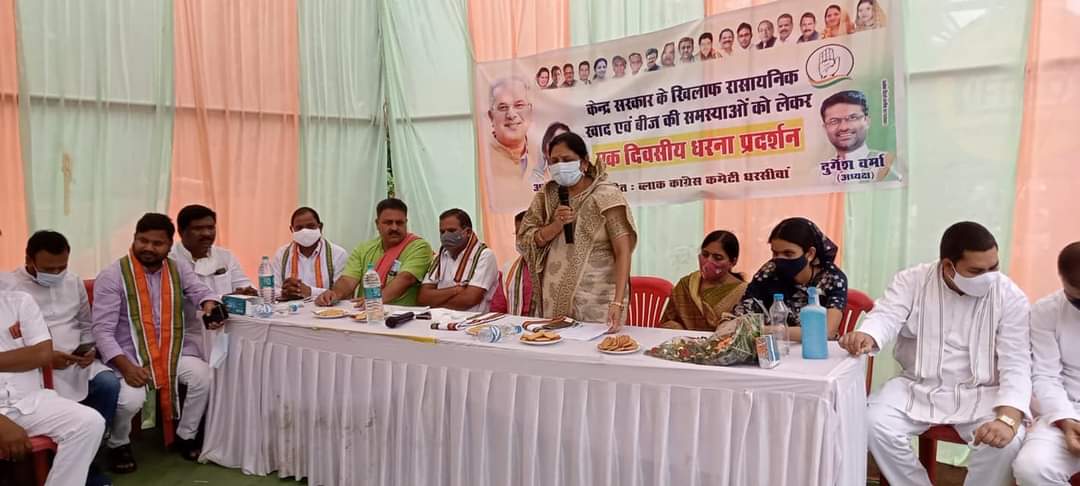 रायपुर:-किसानों को खाद् व बीज की अनुपलब्धता को लेकर, केंद्र सरकार के खिलाफ राजधानी के धरसींवा ब्लाक में कांग्रेस का एक दिवसीय धरना प्रदर्शन,