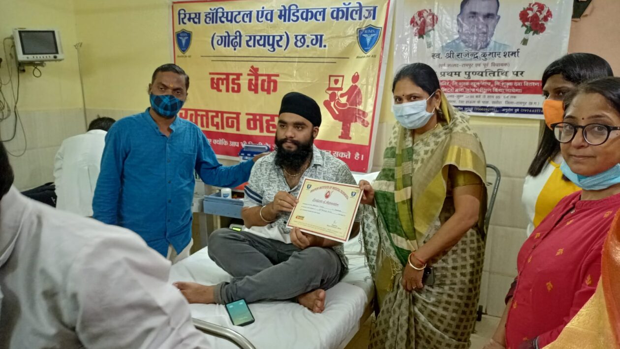 रायपुर के खरोरा आशीर्वाद हॉस्पिटल एवं रिम्स मेडिकल ( रिम्स मेडिकल कॉलेज की शाखा ) द्वारा नि: शुल्क डॉक्टरों द्वारा जांच नि: शुल्क चिकित्सक परामर्श नि: शुल्क खून जांच नि: शुल्क दवा वितरण स्वैच्छिक रक्त दान शिविर सिकलिंग, थैलेसिमिया, गर्भवती माताओं के लिए यह रक्तदान शिविर का आयोजन आशीर्वाद हॉस्पिटल खरोरा में किया गया था जिसमें धरसींवा विधायक – अनिता योगेंद्र शर्मा ने फीता काटकर रक्तदान शिविर का शुभारंभ किया । इस अवसर पर विधायक श्रीमती शर्मा ने स्वयं का चेक अप भी करवाया साथ ही जिन लोगो ने रक्तदान किया उन्हें प्रशस्ति पत्र देकर सम्मानित भी किया। इससे पहले आशिर्वाद हास्पीटल की ओर से अनुराग दुबे एवं रिम्स हास्पिटल के डाक्टरों ने विधायक अनिता योगेंद्र शर्मा का स्वागत किया!कार्यक्रम में रविंदर बबलू भाटिया -प्रदेश महासचिव युवा कांग्रेस छ. ग, पन्ना देवांगन उपाध्यक्ष न.पं.खरोरा,श्रीमति अबिका बंछोर -खरोरा एल्डर मैन,राजा भाटिया,सोनू साहू – ब्लॉक अध्यक्ष युवा कांग्रेस खरोरा, डागेश्वर जोशी -मीडिया प्रभारी धरसींवा विधानसभा व समस्त हॉस्पिटल स्टाफ उपस्थित रहे।