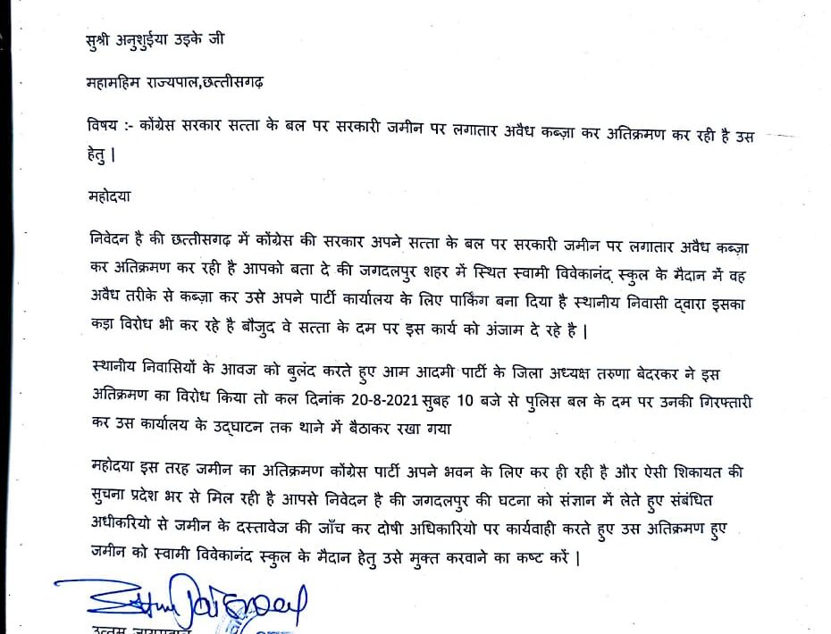 मामले की गंभीरता को देखते हुए आम आदमी पार्टी के प्रदेश सचिव उत्तम जायसवाल ,प्रदेश मीडिया सह प्रभारी अज़ीम खान व यूथ प्रदेश उपाध्यक्ष लक्ष्मण सेन ने राजभवन जाकर महामहिम राज्यपाल के नाम ज्ञापन सौपा व मुलाकात हेतु आवेदन भी दिया है।