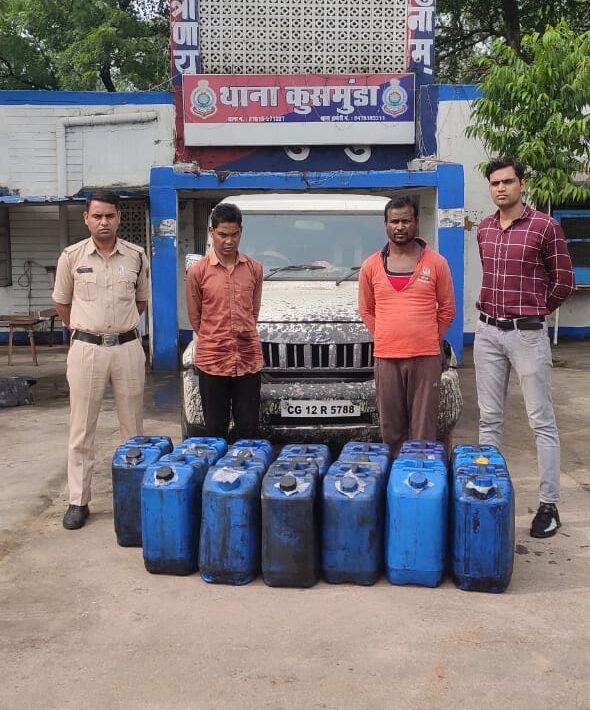 पुलिस अधीक्षक कोरबा श्री भोजराम पटेल (भापुसे) द्वारा जिले में डीजल, कोयला,कबाड़ चोरों के विरूद्व सख्त कार्यवाही करने के निर्देश दिए गए हैं। पुलिस अधीक्षक के निर्देश के पालन मे अति0 पुलिस अधीक्षक श्री कीर्तन राठौर के मार्गदर्शन एवं नगर पुलिस अधीक्षक दर्री श्री खोमन लाल सिन्हा के पर्यवेक्षण में थाना प्रभारी कुसमुण्डा के नेतृत्व मे विशेष टीम का गठन किया गया है। कल दिनांक 23.08.2021 के रात्रि मे मुखबीरों के माध्यम से सूचना मिला की 01 बोलेरो वाहन क्र0 सीजी 12 आर 5788 मे कुसमुण्डा खदान से डीजल चोरी कर परिवहन किया जा रहा है। उपरोक्त सूचना पर कुसमुण्डा पुलिस द्वारा तत्काल घेराबंदी कर बोलेरो वाहन को रोकने का प्रयास किया गया। पुलिस को देखकर बोलेरो वाहन का चालक वाहन का रफ्तार बढ़ाकर भागने लगा कुसमुण्डा पुलिस द्वारा 02 अलग अलग वाहनों से भाग रहे बोलेरो वाहन को अलग अलग दिशाओं से पीछा किया गया। बोलेरो वाहन का चालक पकड़े जाने से बचने हेतु वाहन को कुसमुण्डा खदान के अंदर बने रास्ते मे तेज रफ्तार से अलग अलग दिशाओं मे चलाकर भागने का प्रयास करता रहा किंतु पुलिस द्वारा दोनो रास्तों पर की गई मजबूत घेराबंदी के कारण अंततः पकड़ा गया। पुलिस वाहन को नजदीक आते देखकर वाहन मे सवार कुछ लोग भाग गए वाहन मे महेन्द्र कुमार चैहान एवं जान सिंह कंवर पकड़े गए। वाहन की तलाशी लेने पर वाहन में 40 लीटर क्षमता वाले 13 जरीकेन मे भरा हुआ डीजल लगभग 500 लीटर बरामद हुआ। जिसे पुलिस द्वारा धारा 41(1-4) जा.फौ./379 भादवि0 के अंतर्गत जप्त कर आरोपीगण को गिरफ्तार कर न्यायिक रिमाण्ड पर भेजा जा रहा है। मामले मे फरार आरोपी एवं डीजल चोरी मे संलिप्त अन्य आरोपीयों की तलाश की जा रही है।