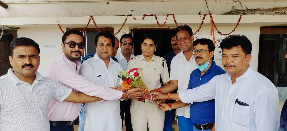 व्यापारी संघ द्वारा पुष्पकुच्छ भेंटकर थाना प्रभारी मंजूलता राठौड़ का स्वागत किया गया