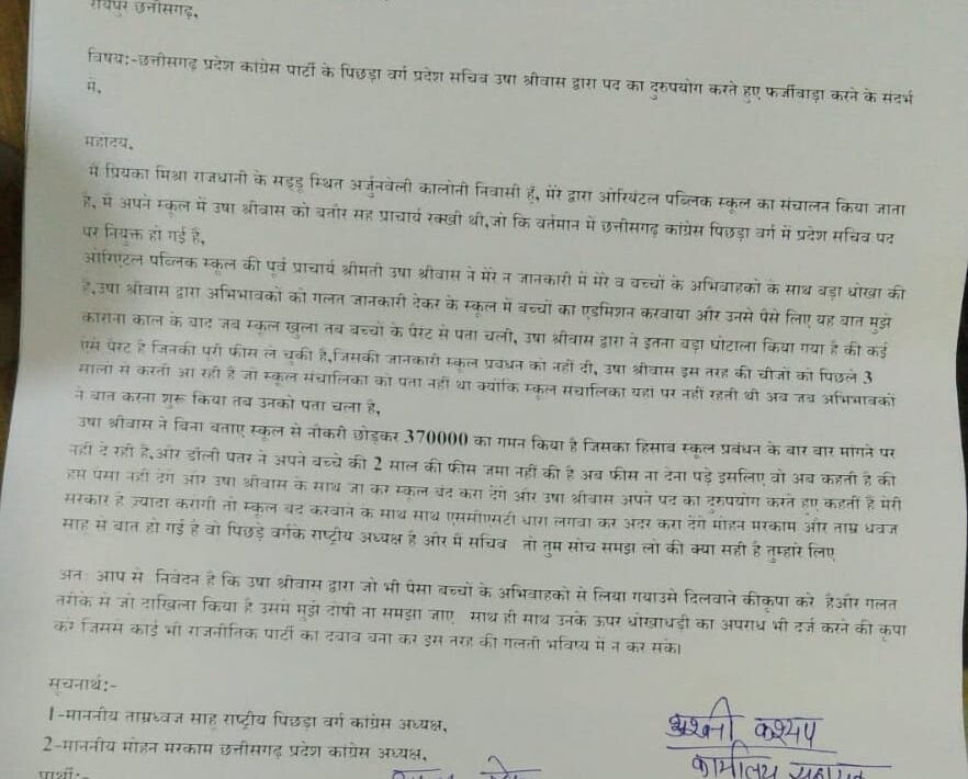 रायपुर,प्रदेश कांग्रेस पिछड़ा वर्ग की सचिव उषा श्रीवास द्वारा ओरिएंटल पब्लिक स्कूल में प्राचार्य रहते हुए 3लाख 70 हजार के गबन का आरोप ओरिएंटल पब्लिक स्कूल के संचालिका द्वारा लगाये जाने को लेकर ओरियन्टल पब्लिक स्कूल की संचालिका ने प्रदेश के गृहमंत्री, प्रदेश कांग्रेस अध्यक्ष मोहन मरकाम सहित रायपुर उप पुलिस महा निरीक्षक को शिकायत पत्र दिया है