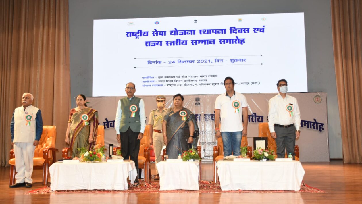 रायपुर। आज मौका था राष्ट्रीय सेवा योजना (एनएसएस) के स्थापना दिवस एवं राज्य स्तरीय सम्मान समारोह का। जहाँ छत्तीसगढ़ की राज्यपाल अनुसुईया उइके मुख्य अतिथि के रूप में विज्ञान महाविद्यालय स्थित पं. दीनदयाल उपाध्याय ऑडिटोरियम में आयोजित मंच पर उपस्थित थीं। जहाँ क्षेत्रिय विधायक व संसदीय सचिव विकास उपाध्याय के साथ-साथ पं. रविशंकर शुक्ल विश्वविद्यालय के कुलपति डॉ. वर्मा, उच्च शिक्षा विभाग के सचिव भुवनेश यादव एवं आयुक्त शारदा वर्मा सहित एनएसएस से जुड़े डॉ. समरेन्द्र सिंह एवं दर्शक दिर्घा पर सैंकड़ों की संख्या में उच्च शिक्षा से जुड़े प्रबुद्धजन और विद्यार्थी मौजुद थे। इस कार्यक्रम में खास बात जो थी वह विकास उपाध्याय के कार्यप्रणाली पर किए जा रहे प्रशंसा का था जो सभी का ध्यान खींच रहा था।