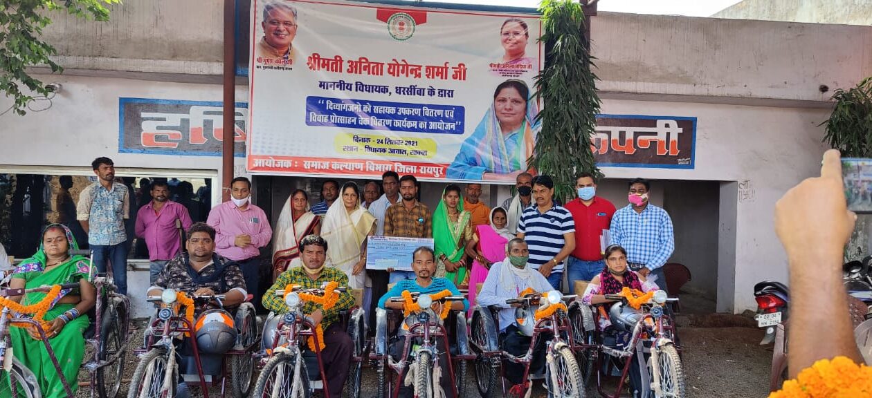 0 विवाह प्रोत्साहन राशि व श्रवण यंत्र बटे– काफी लंबे समय के बाद धरसींवा विधायक श्रीमती अनिता शर्मा ने अपने कार्यालय में एक सेवा भाव कार्यक्रम का आयोजन किया जिसमें 09 लोगो को बैटरी चलित ट्रायसिकल, एक विकलांग नव दम्पति को मुख्यमंत्री विवाह प्रोत्साहन राशि के रूप में 50 हजार रुपये की चेक के साथ कुछ अन्य दिव्यांगों को ट्राईसाईकिल प्रदान किया गया।