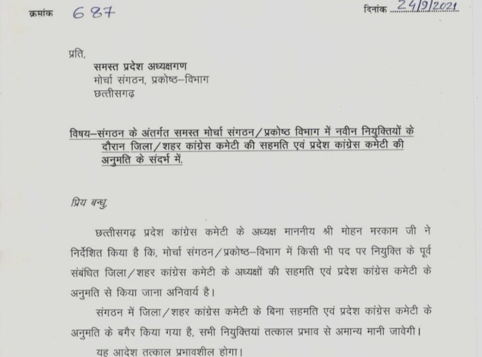 शुक्ला ने जारी पत्र में बताया कि छत्तीसगढ़ प्रदेश कांग्रेस कमेटी के अध्यक्ष मोहन मरकाम ने निर्देशित किया है कि, मोर्चा संगठन / प्रकोष्ठ विभाग में किसी भी पद पर नियुक्ति के पूर्व संबंधित जिला / शहर कांग्रेस कमेटी के अध्यक्षों की सहमति एवं प्रदेश कांग्रेस कमेटी के अनुमति से किया जाना अनिवार्य है।