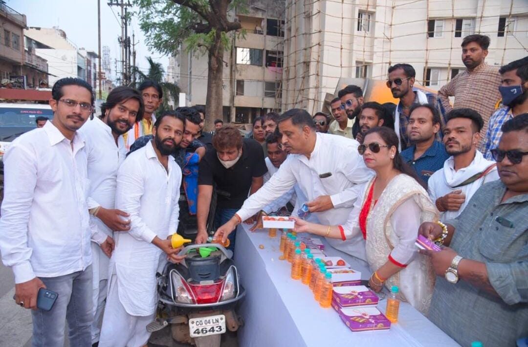 रायपुर 02 नवम्बर 2021। शहर जिला कांग्रेस कमेटी के द्वारा आज राजधानी रायपुर के सिटी कोतवाली चौक पर लगातार बढ़ती महंगाई और डीजल पेट्रोल के मूल्य मे वृद्धि के विरोध अनोखा विरोध प्रदर्शन किया गया। जिसमे मोटर सायकिल चालको को रोककर उनके पेट्रोल टंकी पर आधा लीटर पेट्रोल दिवाली के उपलक्ष्य मे दिपावली उपहार दिया गया और साथ मे मिठाईयो के डिब्बे मे मिठाई की जगह आलू प्याज टमाटर हरि मिर्च लहसून आदि डालकर उपहार स्वरूप राहगीरो को दिया गया।केंद्र सरकार के विरोध मे जमकर नारे लगाये गये।