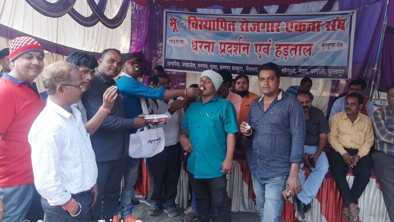 भूविस्थापित किसानों का धरना 20 वें दिन भी जारी,काले कृषि कानूनों की वापसी पर मिठाई बांटकर मनाई खुशियां और कहा:एसईसीएल भी लें अपने काले कानून वापस