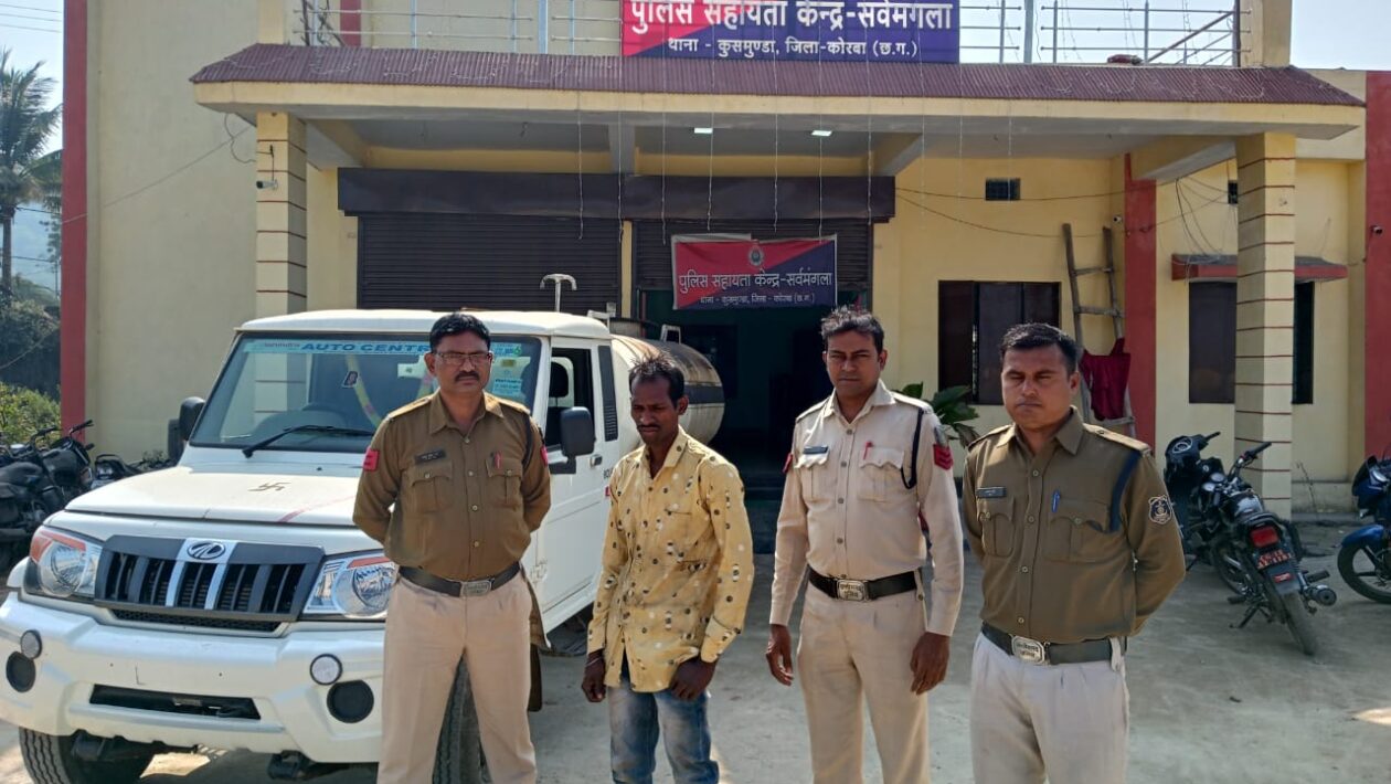 मामले का संक्षिप्त विवरण इस प्रकार है कि श्रीमान पुलिस अधीक्षक महोदय कोरबा श्री भोजराम पटेल द्वारा क्षेत्र में डीजल, कोयला, कबाड़ चोरो के विरुद्ध सख्त कार्यवाही के संबंध में दिये गये निर्देशों के परिपालन में श्रीमान अतिरिक्त पुलिस अधीक्षक श्री अभिषेक वर्मा व श्रीमान नगर पुलिस अधीक्षक सुश्री लितेश सिंह के मार्गदर्शन पर चोरों पर शिकंजा कसने के विशेष अभियान के तहत चोरों के विरूद्ध कार्यवाही करने हेतु आदेशित किया गया है, जो दिनांक 09.12.2021 को रात्रि गश्त दौरान मुखबिर से सूचना मिला कि कुसमुण्डा खदान से बोलेरो पीकअप टँकर में डीजल चोरी ले जा रहा है कि इस सूचना पर तत्काल पुलिस सहायता केन्द्र सर्वमंगला व थाना कुसमुण्डा पुलिस टीम के द्वारा चंद्रनगर जटराज के पास एक सफेद रंग की बिना नंबर की बोलेरो पीकअप टेंकर आते दिखा जिसे घेराबंदी कर रोककर पूछताछ करने पर वाहन चालक ने अपना नाम लखनलाल चौहान पिता सुखसिंह चौहान उम्र 27वर्ष पता करईनारा मड़वारानी थाना उरगा जिला कोरबा का निवासी होना तथा कुसमुण्डा खदान से उक्त बिना नंबर के बोलेरो पीकअप टँकर में डीजल चोरी कर लाना बताया। आरोपी के उक्त बोलेरो पीकअप टैंकर में भरे कुल 800 लीटर डीजल कीमती 80000 रूपये व वाहन कुल कीमती 400000 रूपये को जप्त कर कब्जा पुलिस लिया जाकर आरोपी को विधिवत गिरफ्तार कर न्यायायिक रिमाण्ड पर भेजा गया है। थाना कुसमुण्डा व पुलिस सहायता केन्द्र सर्वमंगला क्षेत्रांतर्गत लगातार डीजल, कबाड़ चोरों तथा अवैध कारोबारियों के विरुद्ध अभियान चलाकर कार्यवाही की जा रही है।