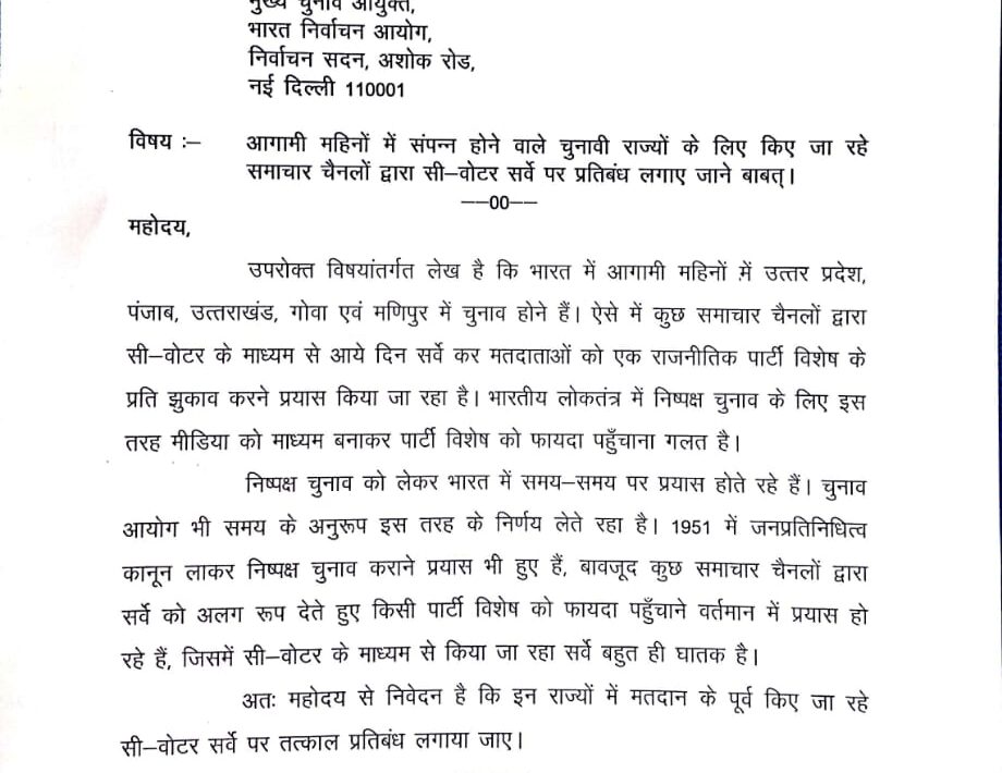 कांग्रेस पार्टी के राष्ट्रीय सचिव विकास उपाध्याय ने चुनाव आयोग को पत्र भेजकर कहा, सी-वोटर सर्वे पर रोक लगाई जाए