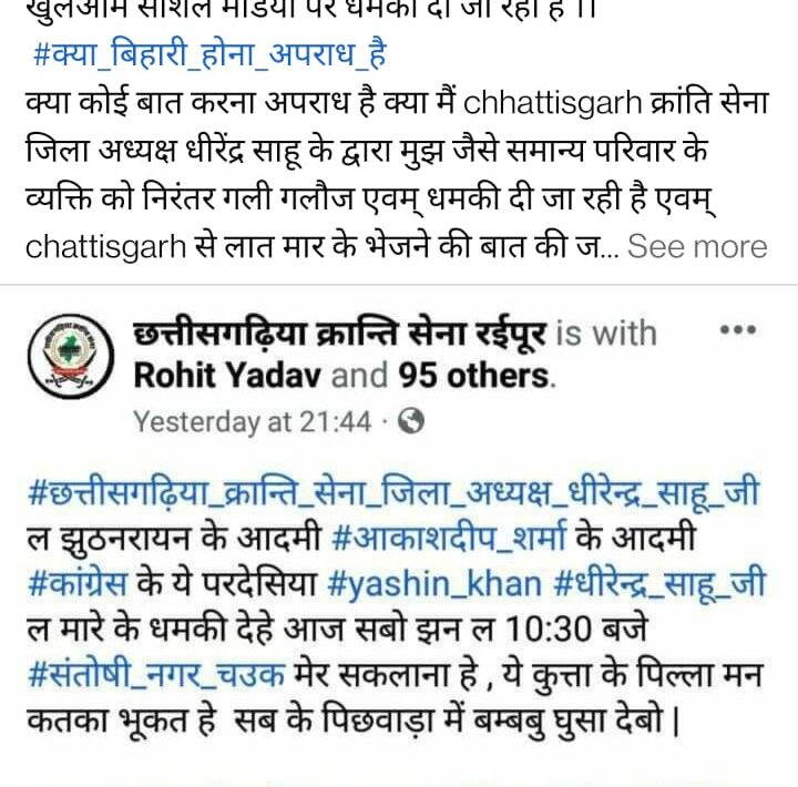 क्या कोई बात करना अपराध है क्या मैं chhattisgarh क्रांति सेना जिला अध्यक्ष धीरेंद्र साहू के द्वारा मुझ जैसे समान्य परिवार के व्यक्ति को निरंतर गली गलौज एवम् धमकी दी जा रही है एवम् छत्तीसगढ़ से लात मार के भेजने की बात की जा रही है जब मैंने हमारे माहौले के युवा कांग्रेस नेता यासीन खान जी को इस बारे मै बताया तो वहा लोग उसे भी धमकी एवम् सोशल मीडिया मै गलत आरोप लग कर सम्प्रदायिक माहौल खराब करने मेरे घर के पास इखता हो कर मेरे व मेरे परिवार को तनाव देने चाहते है क्या ये छत्तीसगढ़ मै हम बाहर के नही बल्कि chattisgarh के है भारत देश के है। ये व्यक्तिगत मामला है सम्प्रदायिक नही ऐसी विचारधारा वाले संघठन से देश की अखंडता और भाईचारे को खतरा है । इसे तत्काल बन्द कर देना चाहिए ।