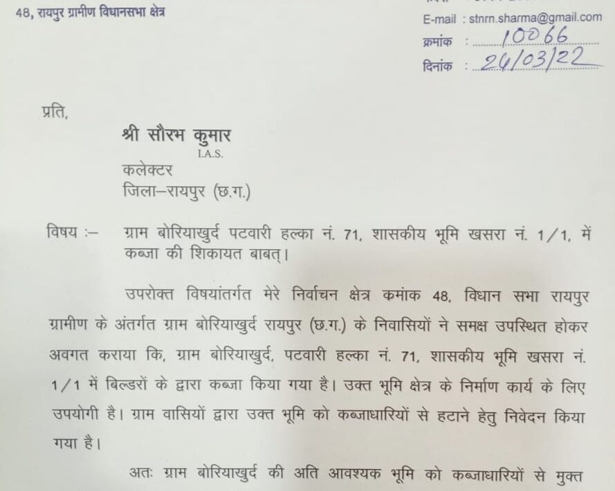 रायपुर– ग्राम बोरिया खुर्द पटवारी हल्का नंबर 71 शासकीय भूमि खसरा नंबर 1/1 में कब्जे को लेकर सरकारी बैंक अध्यक्ष श्री पंकज शर्मा के नेतृत्व कलेक्टर के नाम ज्ञापन सौंपा गया। ग्रामीणों द्वारा ग्रामीण विधानसभा विधायक श्री सत्यनारायण शर्मा से शिकायत की गई की शासकीय भूमि में बिल्डरों द्वारा अवैध कब्जा किया जा रहा है जिसको संज्ञान में लेते हुए विधायक द्वारा एक प्रतिनिधि मंडल कलेक्टर से मुलाकात के लिए भेजा गया जिसमें प्रमुख रूप से प्रतिनिधिमंडल का नेतृत्व जिला सहकारी बैंक अध्यक्ष श्री पंकज शर्मा ने एवं ग्रामीण भी शामिल थे श्री पंकज शर्मा ने जानकारी देते हुए बताया कि ग्रामीण विधानसभा रायपुर के अंतर्गत बोरियाखुर्द गांव के शासकीय भूमि पटवारी हल्का क्रमांक 71 खसरा नंबर 1/1 मे बिल्डरों द्वारा अवैध कब्जा किया गया है जिसकी शिकायत आज कलेक्टर को ज्ञापन सौंपकर की गई है एवं जल्द से जल्द कार्रवाई की मांग की गई है उन्होंने कहा कि ग्रामीण विधानसभा क्षेत्र में किसी भी शासकीय जमीन में अवैध कब्जा बर्दाश्त नहीं किया जाएगा चाहे वह कोई भी रहे।