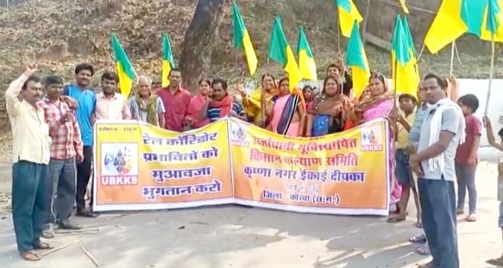 उर्जाधानी संगठन कृष्णा नगर इकाई प्रभावितों की मुआवजा को लेकर रेलवे के कार्य स्थल पर शुरु किया प्रदर्शन