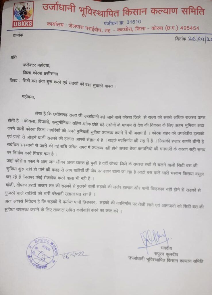 ऊर्जाधानी भुविस्थापित किसान कल्याण समिति ने कोरबा कलेक्टर श्रीमती रानू साहू को पत्र लिखकर सिटी बस की सुविधा बहाल करने और जिले के सड़को की सुधार करने की मांग किया है ।