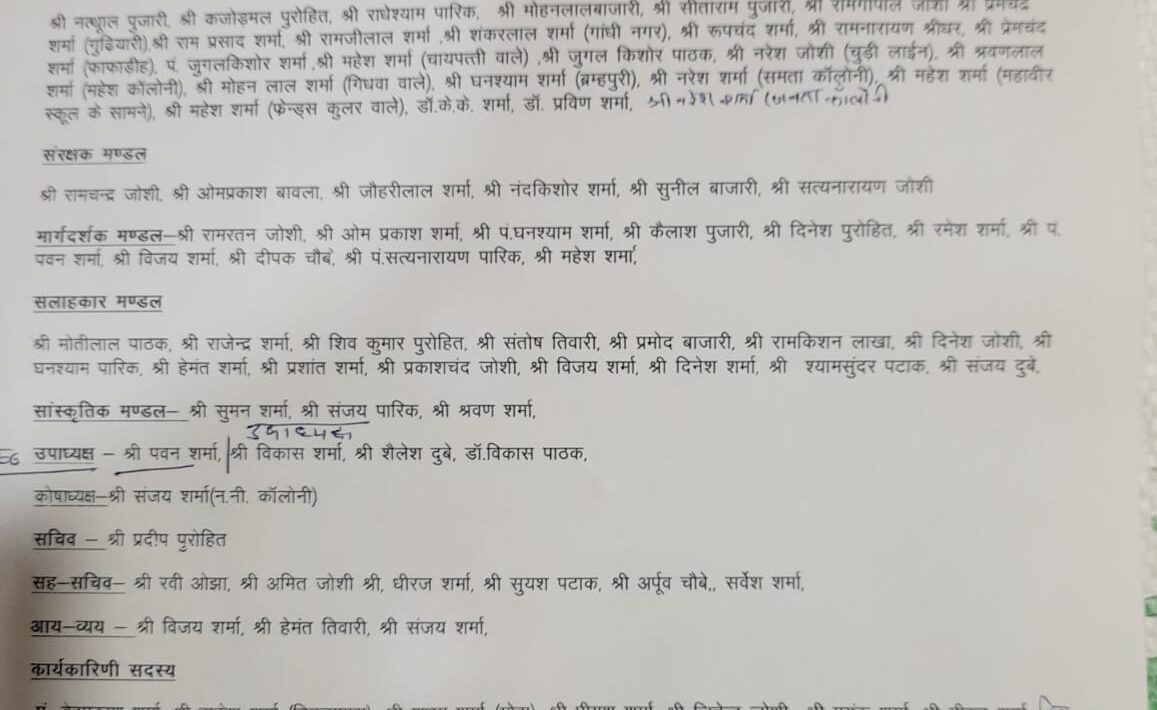 मार्गदर्शन मंडल:-श्री रामरतन जोशी,ओमप्रकाश शर्मा,प.घनश्याम शर्मा,कैलाश पुजारी,दिनेश पुरोहित,रमेश शर्मा,प.पवन शर्मा,विजय शर्मा,दीपक चौबे,प.सत्यनारायण पारीक,महेश शर्मा,
