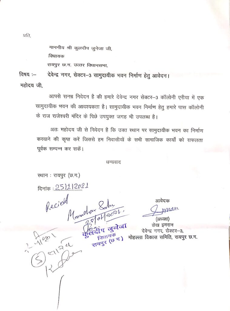 रायपुर,आज विधायक कुलदीप जुनेजा ने देवेंद्र नगर सेक्टर 3 में सामुदायिक भवन के लिए पांच लाख की राशि स्वीकृत की,आप को बतादें देवेंद्र नगर निवासियों की सामुदायिक भवन की बहुप्रतीक्षित मांग को आज विधायक कुलदीप जुनेजा ने अपने विधायक निधि से बनाने के लिए 5 लाख रुपये की स्वीकृति दे दी है,जिसे लेकर देवेन्द्र नगर सेक्टर-3 के वार्ड वाशियों द्वारा विधायक कुलदीप जुनेजा का हृदय से आभार व्यक्त किया गया इस संदर्भ में देवेंद्र नगर सेक्टर-3 के मोहल्ला विकास समिति के अध्यक्ष शेख इमरान ने बताया कि देवेंद्र नगर राजधानी के बीचोबीच होने के कारण वार्ड वाशियों को कोई भी आयोजन करने में बहुत ही ज्यादा परेशानियों का सामना करना पड़ता है,जिसे लेकर विधायंक कुलदीप जुनेजा से बात किया गया विधायक कुलदीप जुनेजा ने वार्ड वाशियों की समस्या को देखते हुए तत्काल अपने विधायक निधि से 5 लाख रुपये सामुदायिक भवन बनाने के लिए स्वीकृति दे दिया है जिसे लेकर